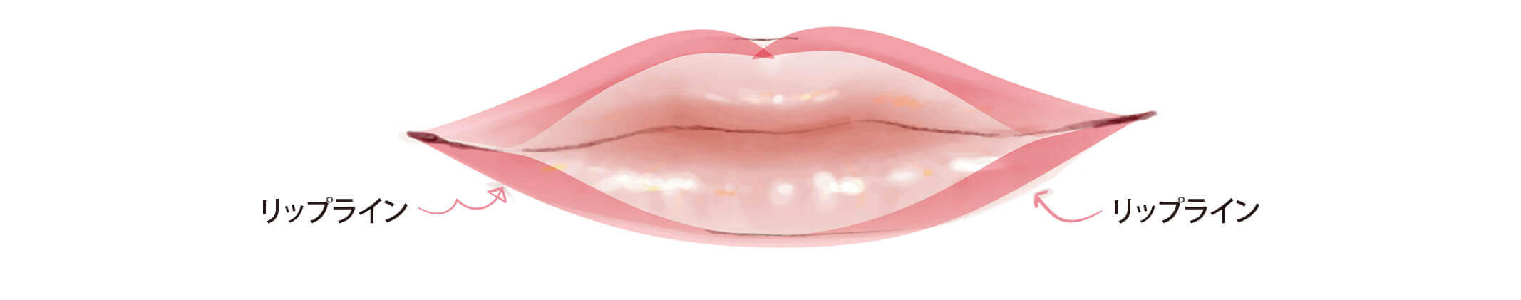 下唇は、リップラインの外側に口角まで引き、上唇は、山の部分のライン外側に入れることで、より唇のラインをきれいに仕上げることができます。
